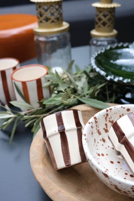 Die kleine Keramikschale „Splash“ überzeugt mit ihrem modernen, gesprenkelten Design in Braun auf cremeweißem Grund. Jede Schale wird in Handarbeit gefertigt und erhält durch die individuelle Sprenkel-Optik einen einzigartigen Charakter. Sie eignet sich perfekt für Snacks, Dips, kleine Beilagen oder als stilvolles Accessoire auf der Kommode.